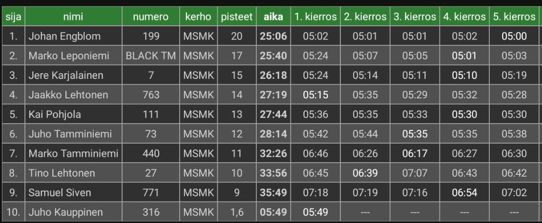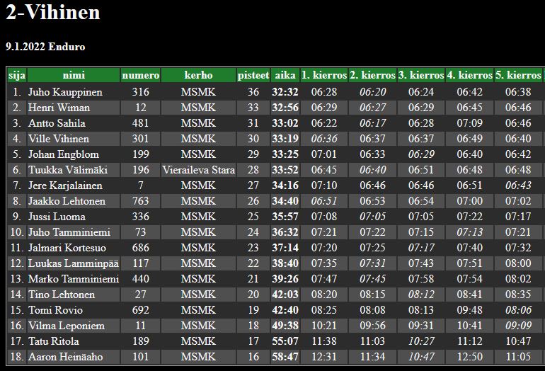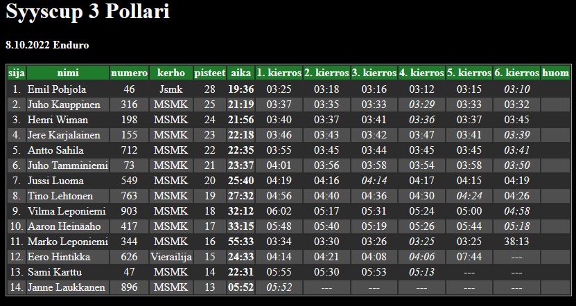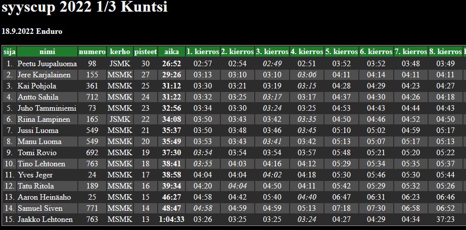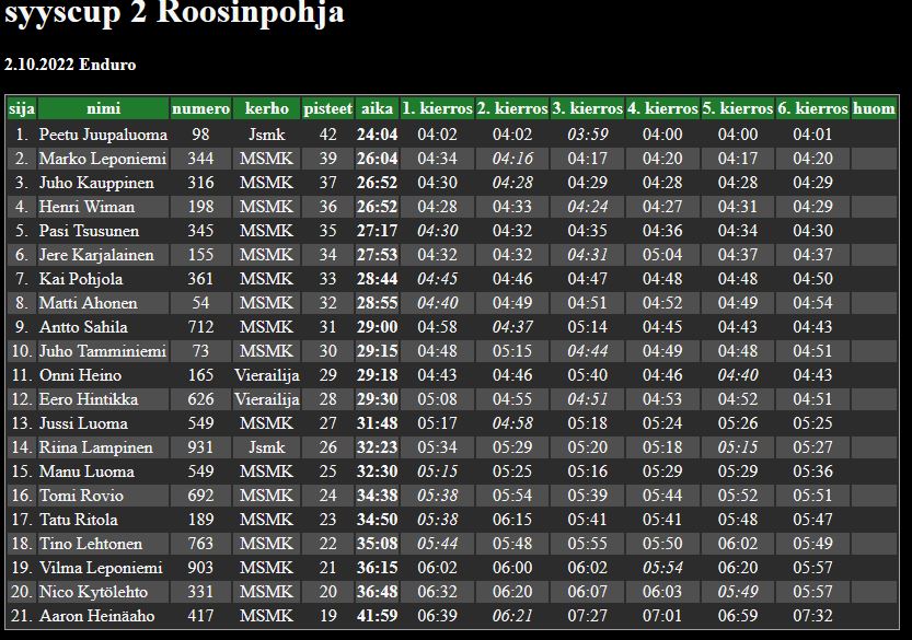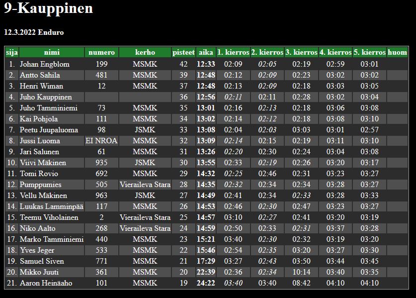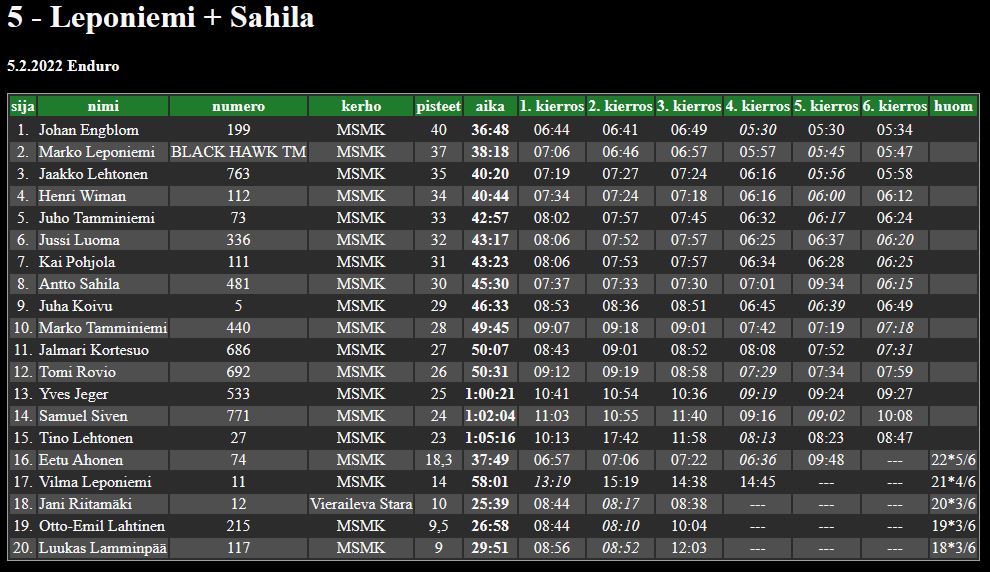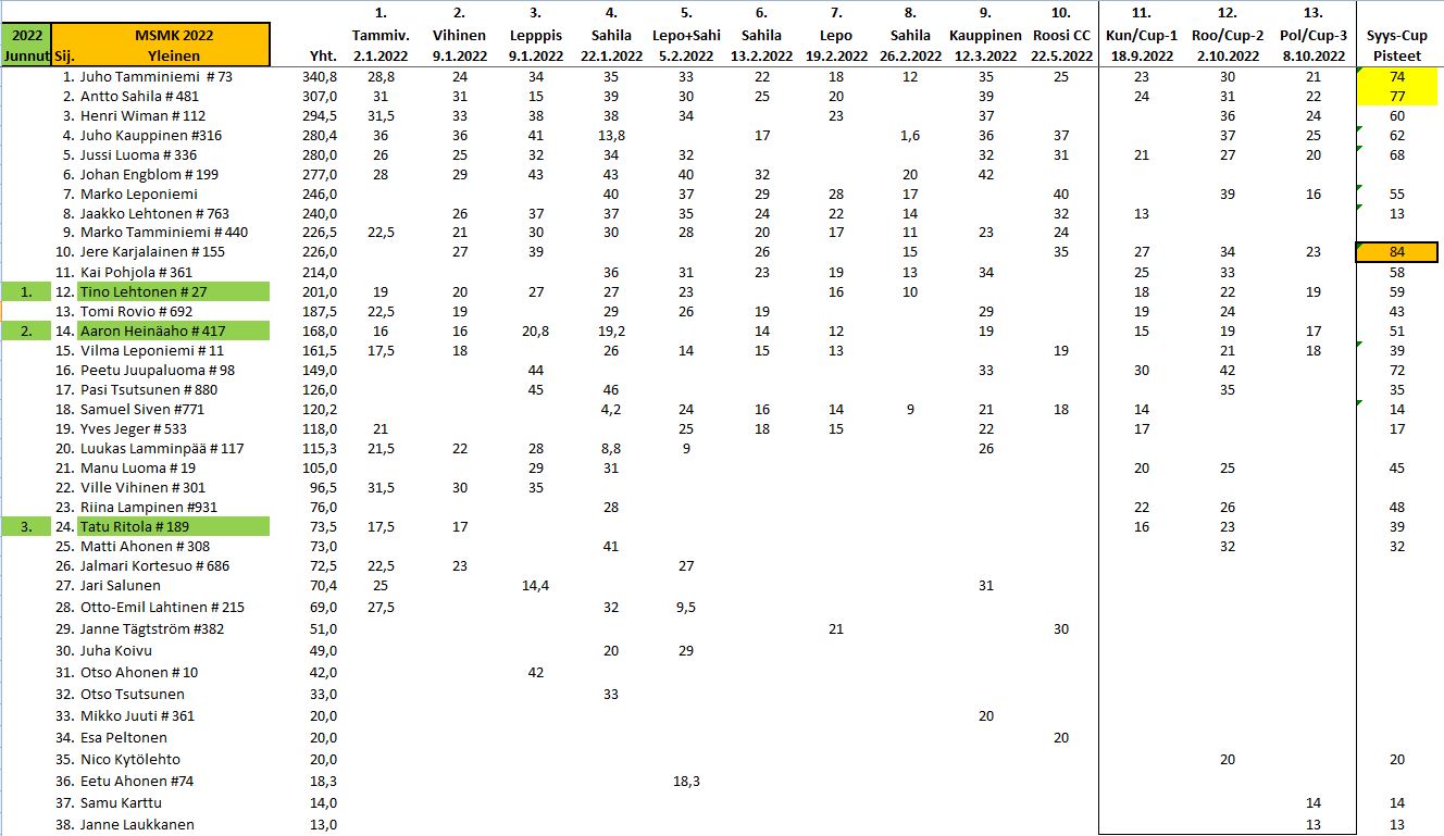 (Enduro + CC + motocross harjoitukset lasketaan samoihin pisteisiin)