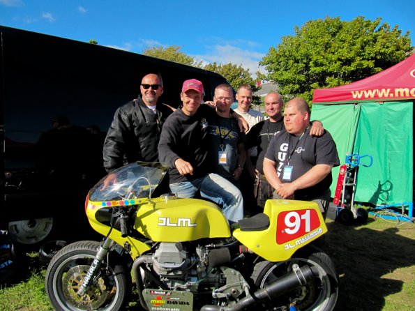 Mukana oli Doningtonin kilpailussa käytetty pyörä varaosina ja oli hetki jolloin Man saaren huoltoteltassa oli kaksi pyörää osina ja kiire saada yksi pyörä kasalle että päästään harjoituksiin mukaan, joissa Jussi ajoi kaikkineen 750 kilometriä. ”Janne Leiman hoiti kuitenkin homman tyylikkäästi Japi Malisen avustuksella ja näin historiaa päästiin tekemään” Jussi toteaa. Kiireen keskellä Esa Väisänen piti huolen siitä että oikeaan aikaan oli homma pysähdytettävä ja Äijät määrättävä syömään jotta energiaa ja hiilihydraatteja oli kun kilpailu käynnistyi. Varikolla ahkeroivat myös Timo Savenius ja Marko Heikkilä.
